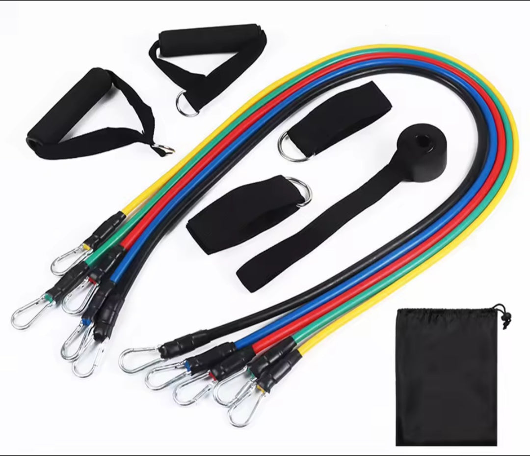 5 أشرطة مقاومة بأوزان مختلفة (تُستخدم بشكل منفصل أو معًا لزيادة المقاومة)
